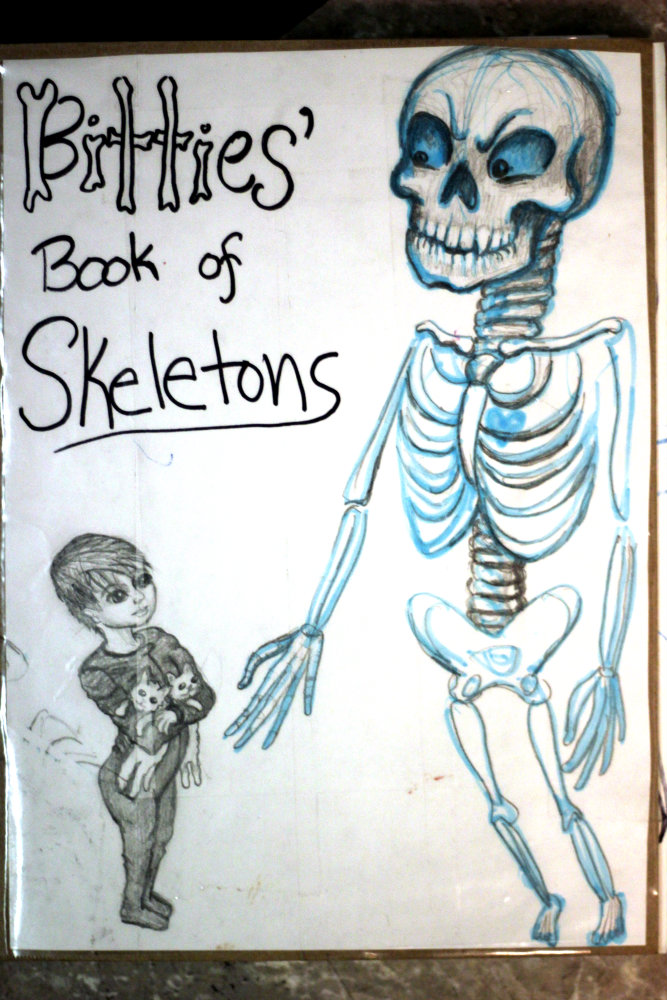 There was a skeleton I'd printed from the computer that looked too sad and it was upsetting him. He kept saying that we needed to make him happy so I drew a new head and glued it over the old one. Now the skeleton looks like he's nonchalantly explaining something. Cracks me up. Bitties is very pleased with the outcome.